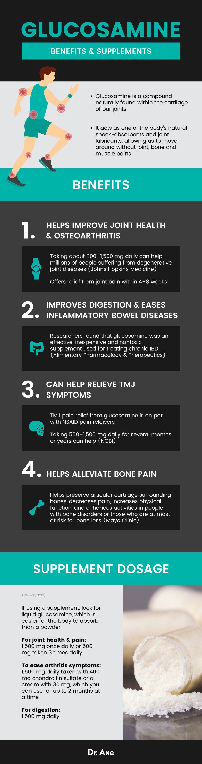 2. Glucosamine: I’m sure everyone has at least heard a little about glucosamine, so lets’s look at why it’s one of my favorites (based on more research from WebMD, Mayo Clinic and Healthline.com)! It is produced naturally in your body and found mostly in cartilage and helps create the proteins and fats that repair our cartilage when it’s damaged. Taking glucosamine supplements offers many benefits (particularly in our joints)!
