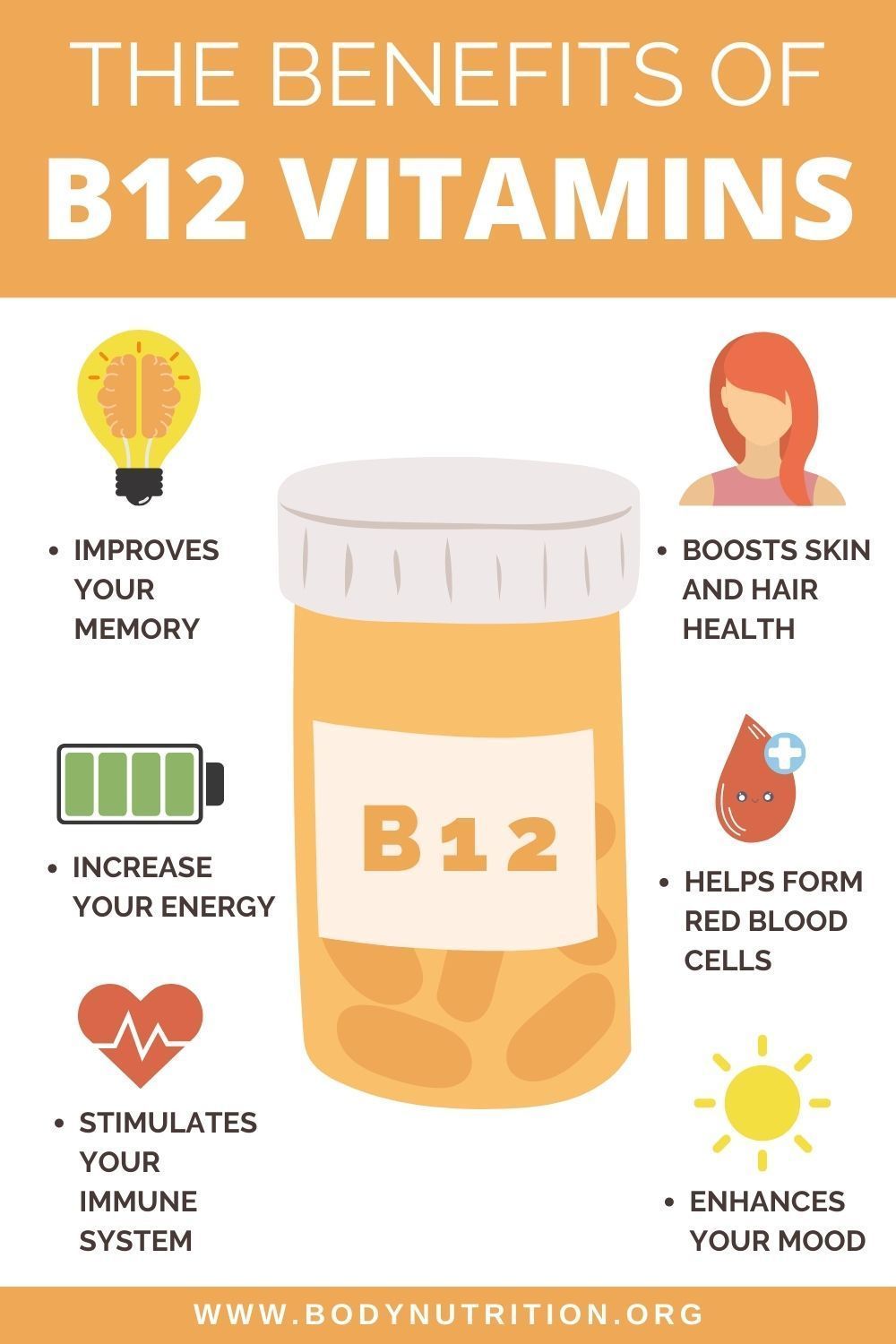 3. Vitamin B12: This vitamin is essential for our bodies, but our bodies do not produce it naturally. B12 has many roles in our bodies, such as supporting the normal functioning of nerve cells and is needed for the formation of red blood cells. Researching Healthline.com I found that Vitamin B12 provides many benefits!
