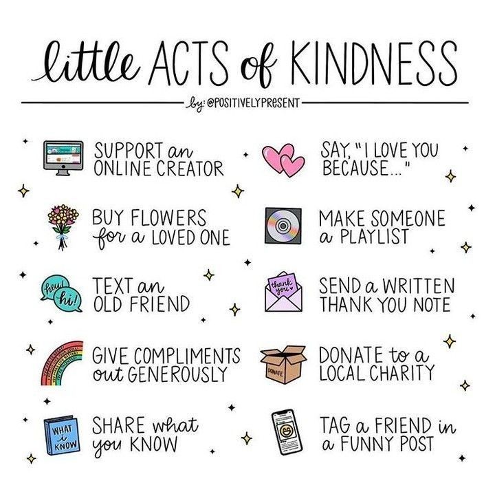 - Practice random acts of kindness to strangers! Just hold the door for someone to enter or exit after you. Let another driver turn out of a store into the gap in front of you. Give your smile to someone who seems grumpy. Offer to return someone’s buggy to the store as you walk in. Compliment another person; if you think to yourself that someone has pretty hair or a beautiful smile – TELL THEM!